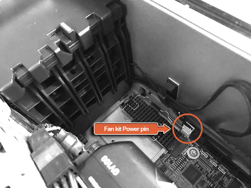 Make sure the fan kit power pin is connected as shown below:
