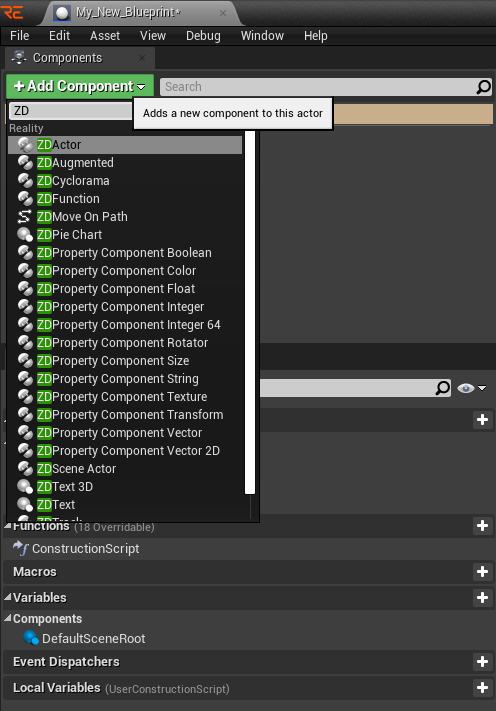 - In the Event Graph, click on ADD COMPONENT button, and type ZD. This actin lists all ZD components. Select the ZD ACTOR component.