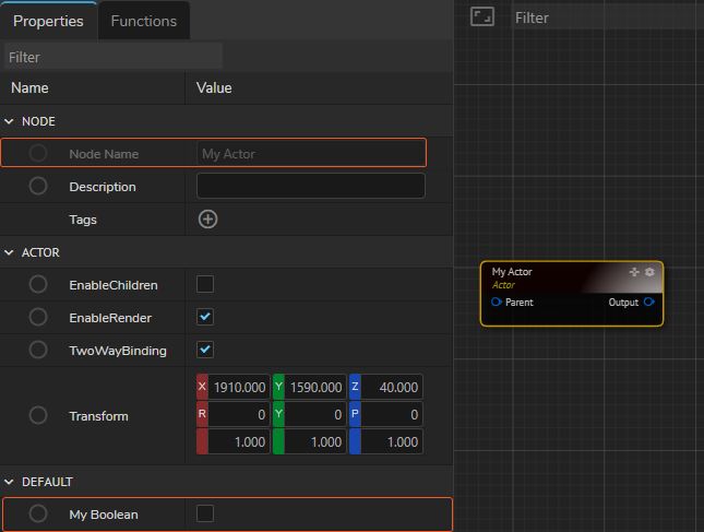 - Add a BOOLEAN parameter, click on the 👁 to make it Public so it can be exposed to the Reality Hub Nodegraph