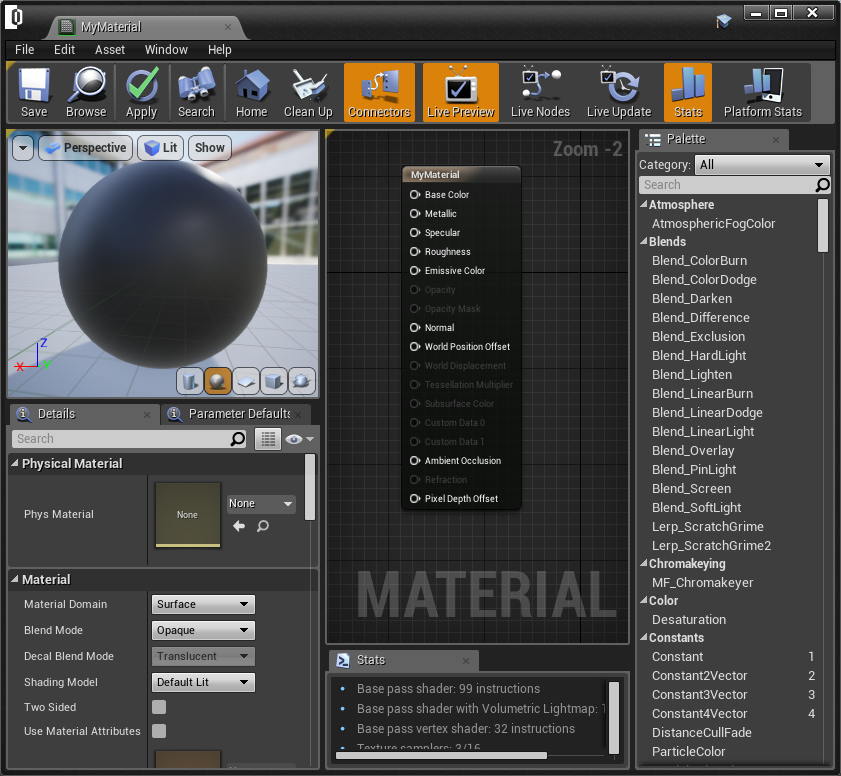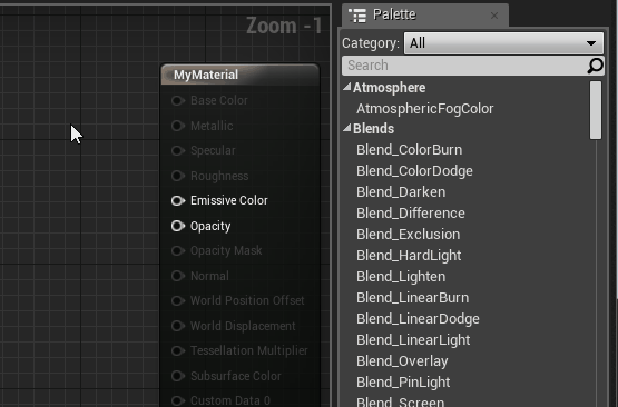 - Select the node from palette which is at right of material editor, drag and drop to the graph.