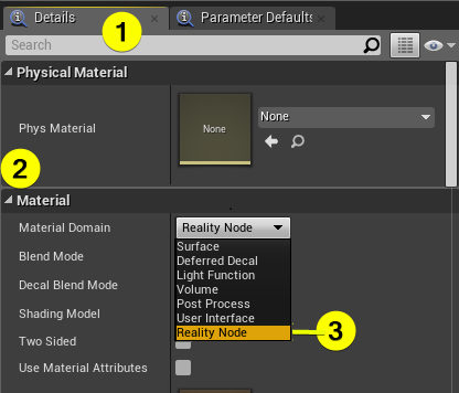 - Change the material domain as REALITY NODE from material section which is inside of details panel. (The details panel located left bottom of material editor.)