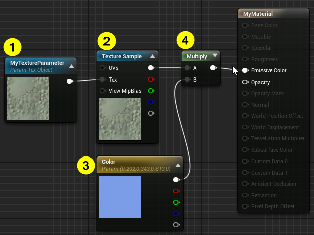 - There were 2 inputs. TEXTUREOBJECTPARAMETER and VECTORPARAMETER. Set them in this section to apply as result.