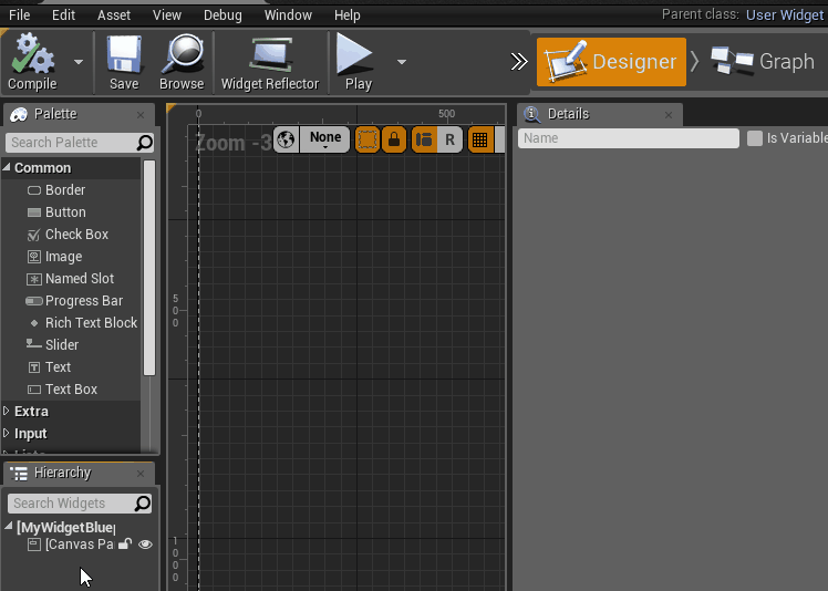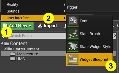 - First of all, create a widget blueprint. Use ADD NEW button which is at the top left corner of the content browser window or access it via right-click an empty area of the content browser and choose it from the component menu.