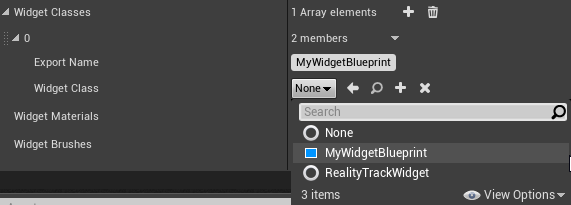 - Add an element to array in UMG tab under the widget classes. Set the Export Name, and set widget class as which you create before.