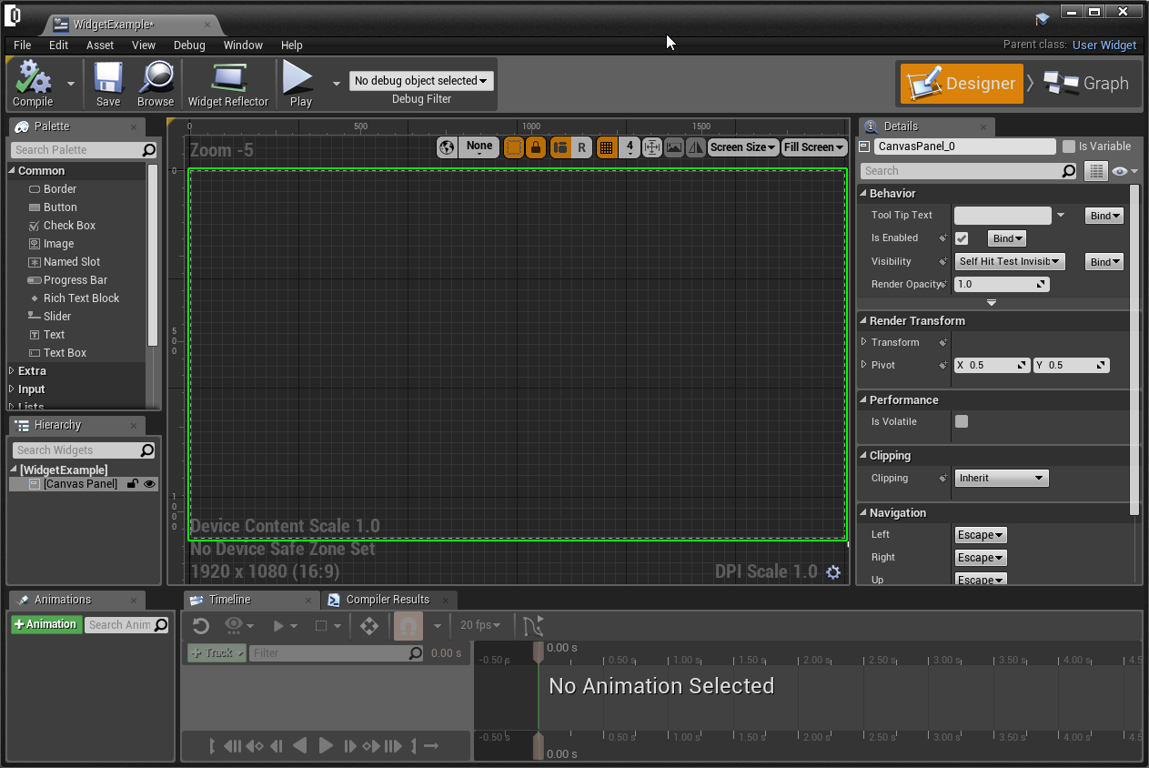 Blueprint object should be added to Content browser. Give it a new name e.g. "WidgetExample." Double click to open it. The blue print window shall open. The widget blueprint window has two tab viz Designer and Graph. (Check the top right of editor) By default, the widget blueprint opens up on Designer tab. Let's add some components and customize them.