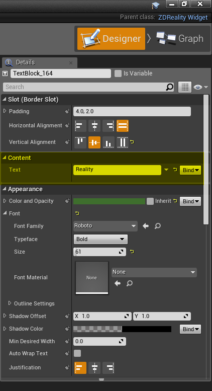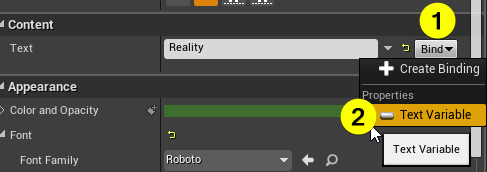 - In details panel, under the content tab, click the bind button then choose the variable. Save changes. Here it is widget blueprint. Let's export it to using in reality setup.