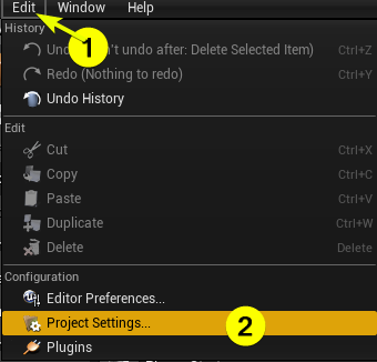 - Close the widget blueprint then open project settings from EDIT → PROJECT SETTINGS