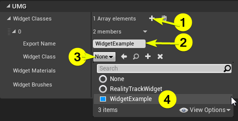 - Add an element to array in UMG tab under the widget classes. Set the Export Name, and set widget class as which you create before.