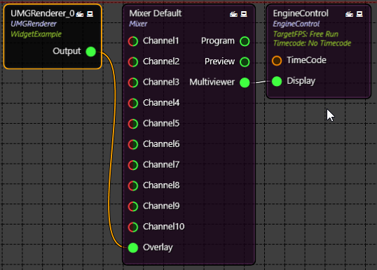 - Now there is an UMGRENDERER node. Let's connect OUTPUT pin of the UMGRENDERER to OVERLAY input of the MIXER node as shown in the below image.