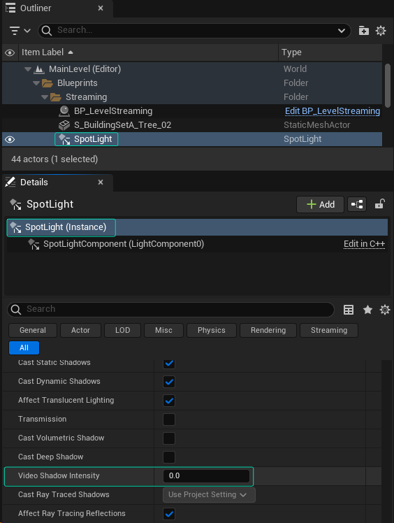 The default value of the Video Shadow Intensity property is 0.0, and at this setting, it will not impact your scene. A property value of 1.0 indicates the full effect.