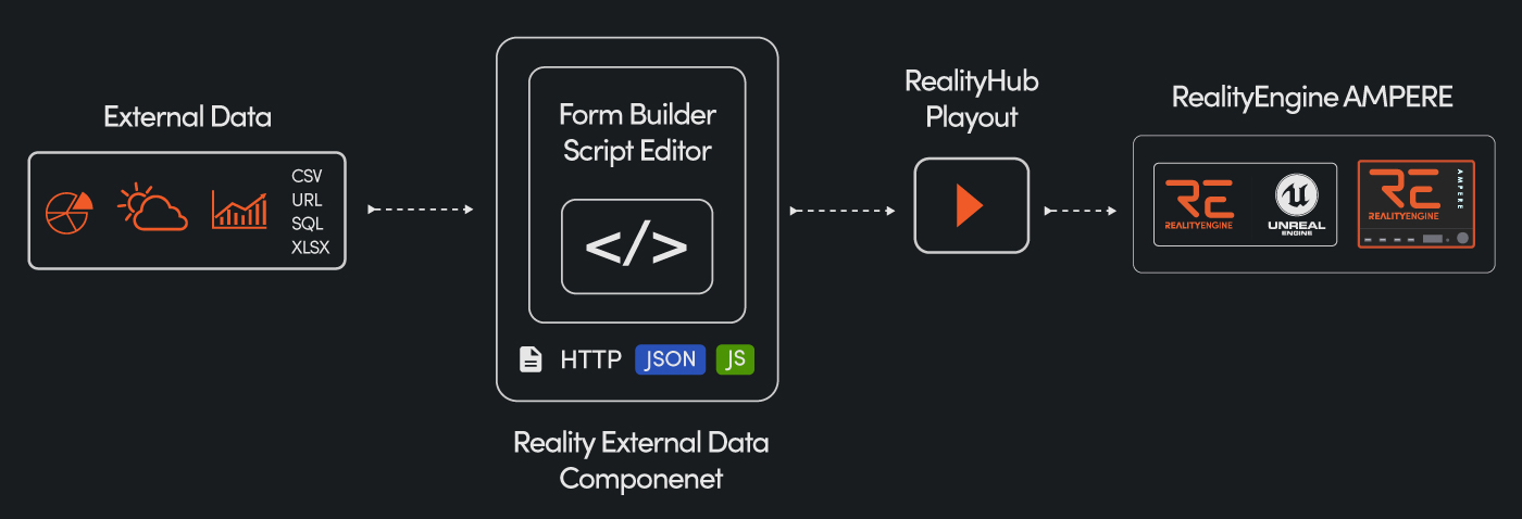Reality Hub allows you to integrate external data sources such as weather, finance, elections, and sports right inside your 3d virtual studio, augmented reality configurations, and mixed reality setup.