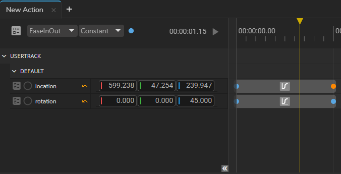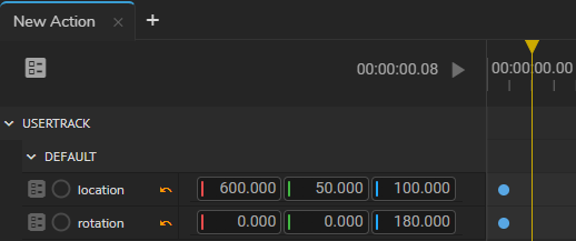 • Go to the first frame in the Action Timeline, right-click on the location property circle, and select the Add Keyframe. Repeat the process for the rotation property.