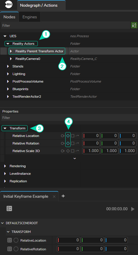 UE5node, go to Nodes section, expand the Reality Actors, then select the Reality Parent Transform Actor. - Go to Properties section, expand the
