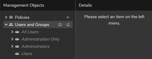 - Management Objects: It is the section where you can govern (Add, Delete, Configure) Policies and Users.