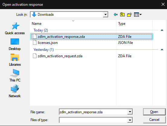 - Select the Activation Response file (*.zda) and click Open, as illustrated above.
