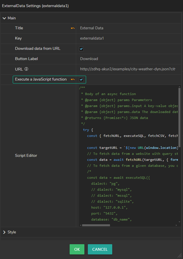 Script Editor inside the ExternalData component allows you to execute a JavaScript function. The sample code inside the Script Editor shows an example of executing JavaScript functions.