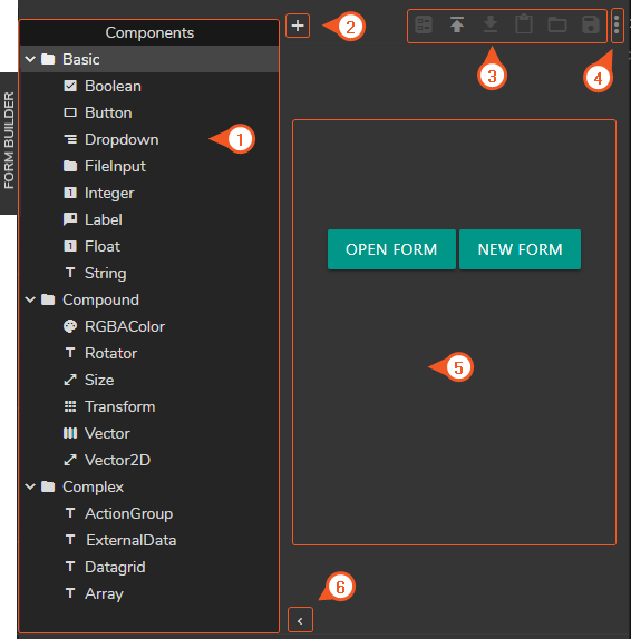 1. Components: Building blocks to create data-driven content. 2. New Form: Creates a new Template Form 3. Form Management Buttons: