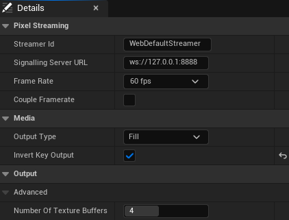 - Go to the Details panel. The image above shows the default values of the Web Streaming Media Output.
