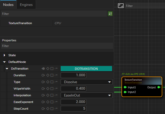 Texture Transition NodeAs the image above illustrates, DoTransition function reveals a set of properties that allows you to fine-tune the transition behavior according to your specific requirements.