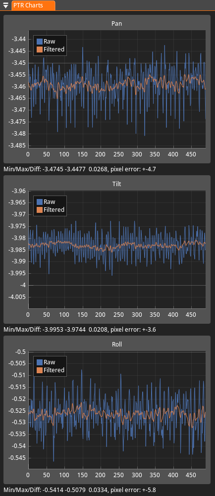 - Angular Noise Charts are for inspecting angular noise in the orientation of the tracked object, separately for pan, tilt, and roll.
